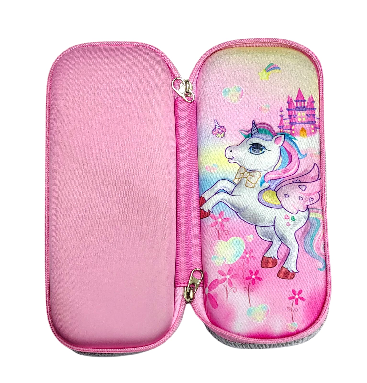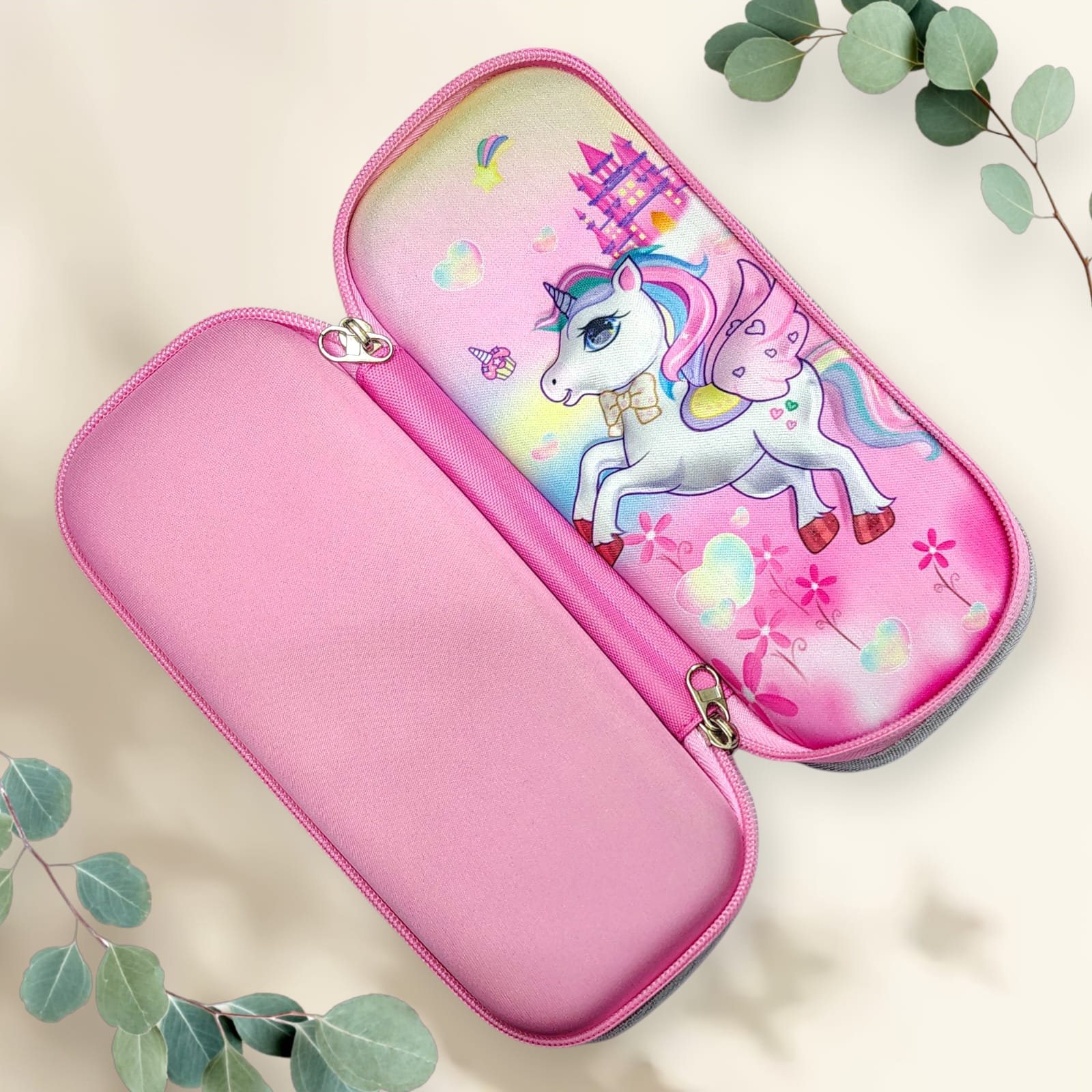 3D Design Embossed Hardtop Cover Pencil Case with Compartments, Pencil Pouch for Kids, School Supply Organizer, Geometry Stationery Box, Cosmetic Zip Pouch Bag (Pink Unicorn-1)