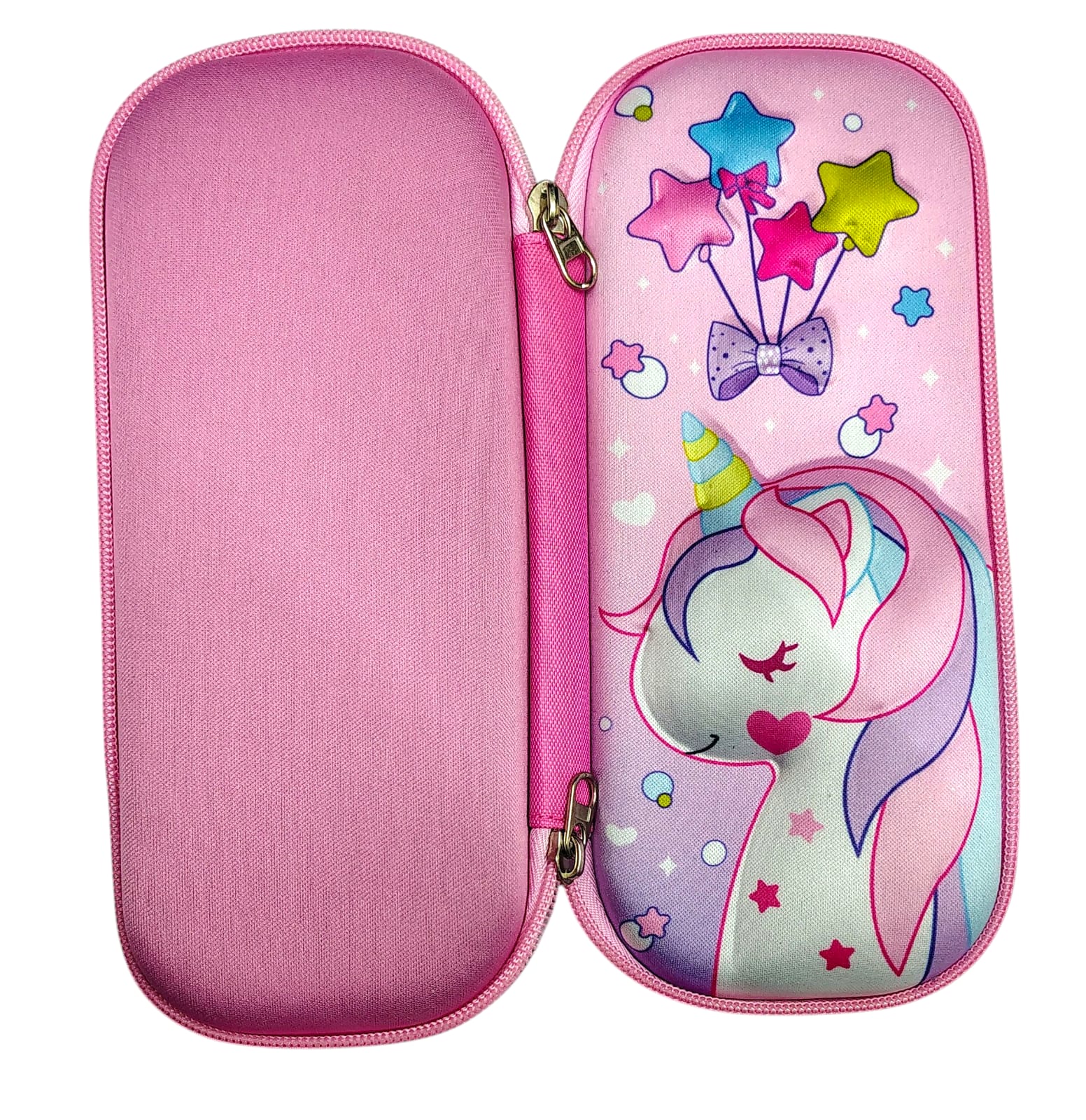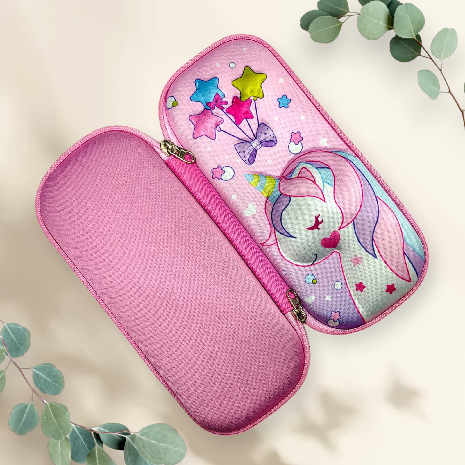 3D Design Embossed Hardtop Cover Pencil Case with Compartments, Pencil Pouch for Kids, School Supply Organizer, Geometry Stationery Box, Cosmetic Zip Pouch Bag (Pink Unicorn)