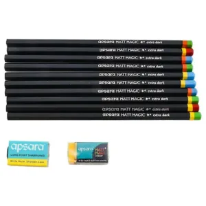 Apsara Matt Magic Extra Dark Pencils are made from high-quality wood for clean and easy sharpening. Its strong medium-soft lead produces long-lasting, smooth and readable strokes without smudging. Easy to hold and with bright coloured wood, it makes for a pretty and cute experience to write for little hands. Buy this product online today!