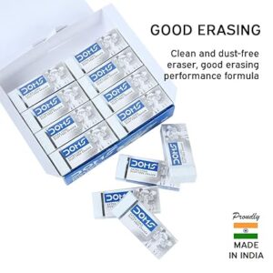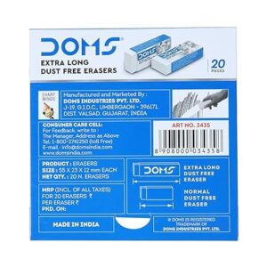 Doms Dust Free Erasers offer premium quality with their extra-long, rubber design for superior graphite removal. Each pack of 20 erasers is phthalate and latex-free, ensuring safety for kids and the environment. Individually wrapped in cellophane, they stay soft and effective, providing long-lasting, mess-free erasing.